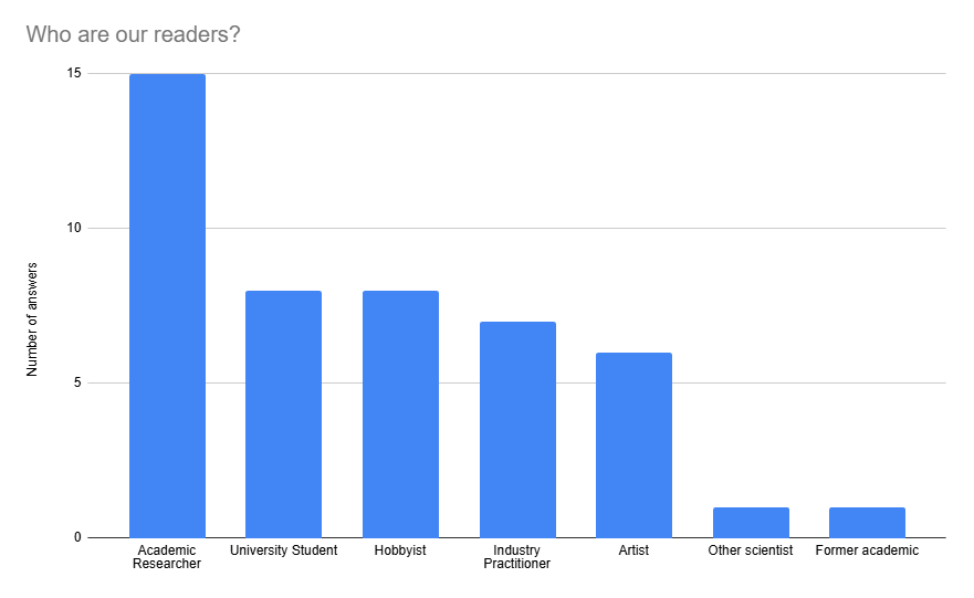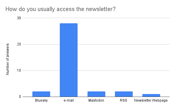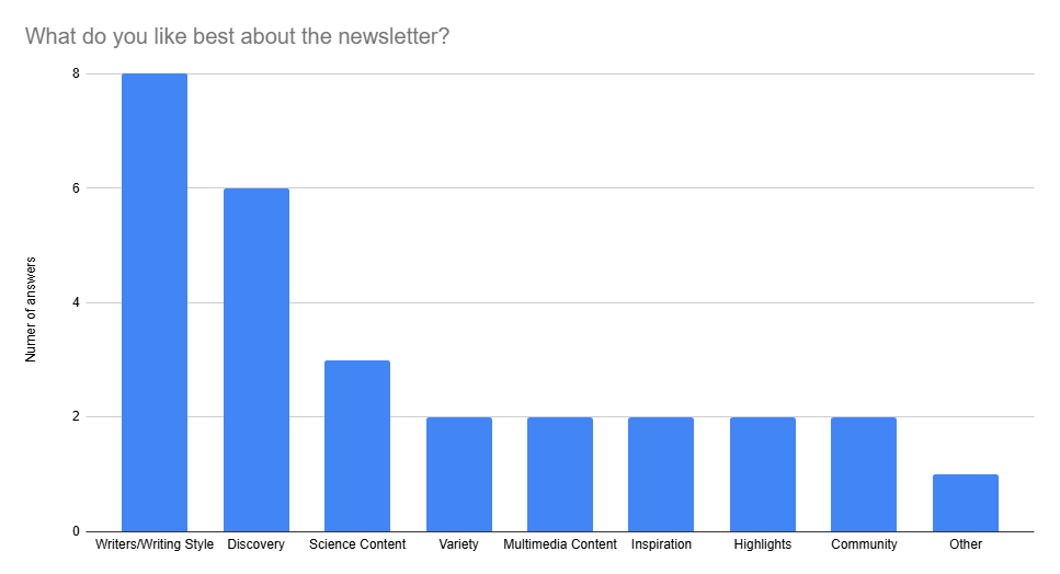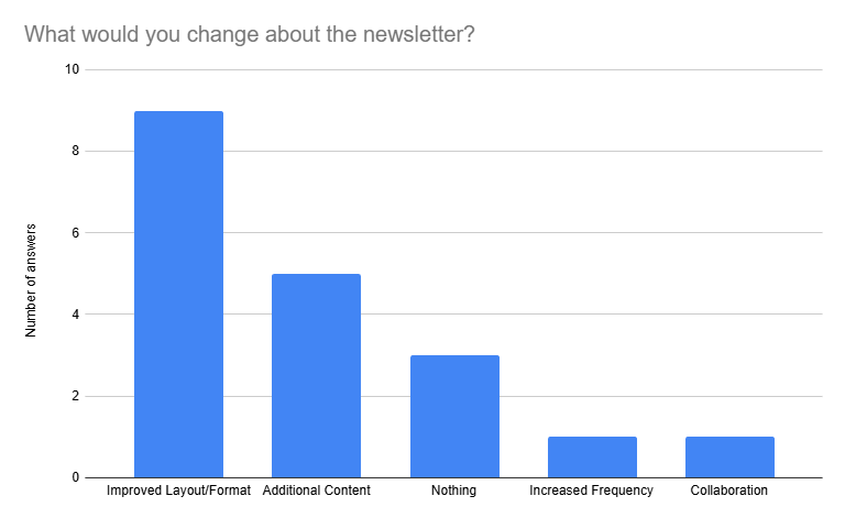 One of our main goals with this survey was to learn what you enjoy about the Newsletter, so that we can do more of that. Summing up the different comments that we received, there was an overall theme of "Paper, People and Projects" as things that the readers most liked. We often include a list of interesting papers that we have found, so you can be sure that there will be more featured papers on the newsletter. The "People" part is interesting -- we used to make interviews, but they turned out to be very work intensive, and so we shifted focus to other things. But knowing that this was a favorite part of the newsletter gives us motivation to think of how add interviews again, hopefully without adding too much workload to the editorial team. That includes interviews with individuals, and also features on working groups and laboratories.