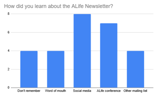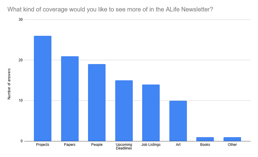Although the Survey is over, we are always interested in hearing the opinions of our readers. Please do feel free to reach to us through social media (or our feedback form) with more comments and ideas about what you want to see in the Artificial Life Newsletter!